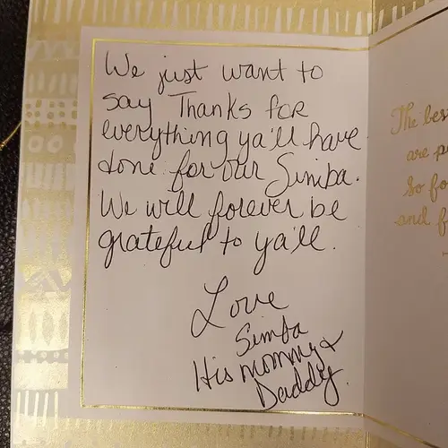 "We just want to say thanks for everything ya'll have done for our Simba. We will forever be grateful to ya'll."- Simba and the Whites