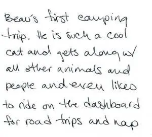 "Beau's first camping trip. He is such a cool cat and gets along w/all other animals and people and even likes to ride on the dashboard for road trips and nap"